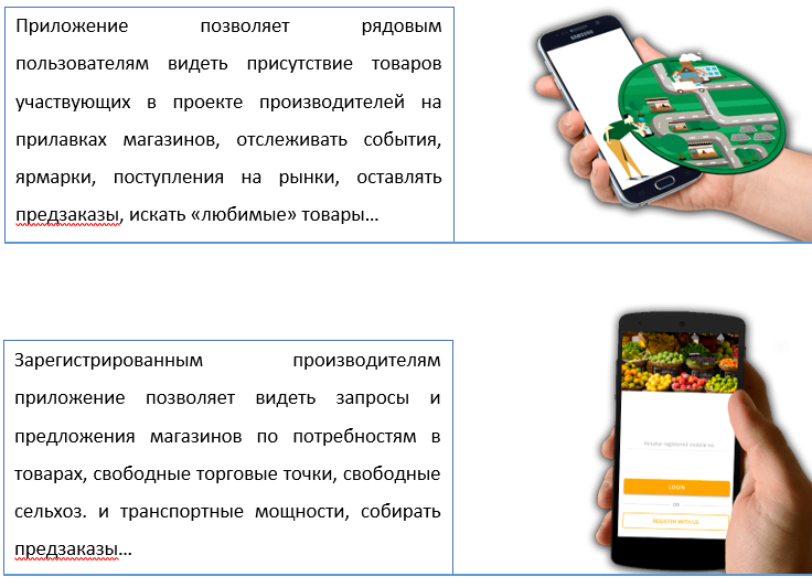 Платформа подразумевает глубокую интеграцию мелких и средних сельхозпредприятий с системой для оптимальной скорейшей доставки продукции на прилавки городов для потребителей, которые ждут конкретную продукцию, что подразумевает гарантированный сбыт и оптимальные цены как поставщикам, так и потребителям.